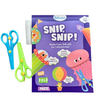 A great scissors skills kit. Includes a variety of cutting pages from easy straight lines to curvy lines and shapes. Comes with 2 pairs of safety scissors.